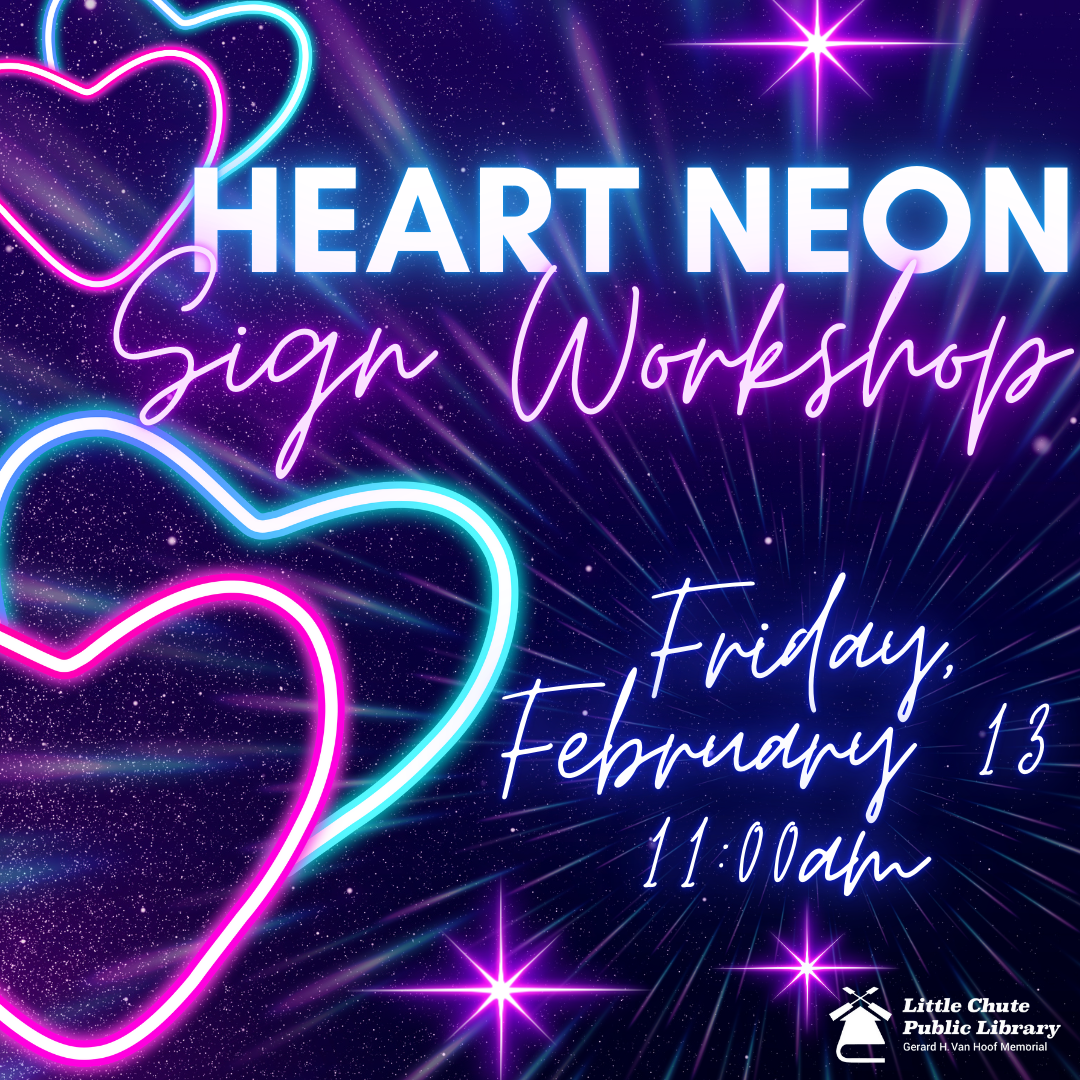 Make a heart-shaped “neon sign” using EL wire on Friday, February 13 at 11:00 AM in room N1/N2 of the Civic Center! Best for teens, adults, and kids ages 10 and up. Younger children can participate, but adult assistance is required. Call 920-788-7825 or visit littlechutelibrary.org to register. Registration starts January 15!