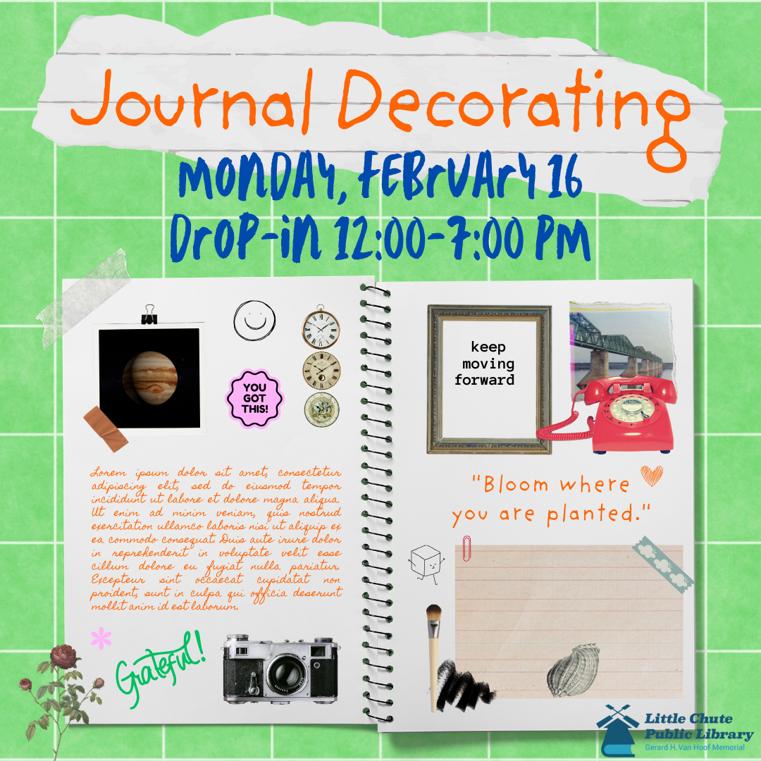Drop-in from 12:00-7:00 PM on Monday, February 16 to decorate a journal with stickers, gems, and more while exploring fun and unique writing prompts. Journals provided, or bring your own to decorate. Ages 12-18.